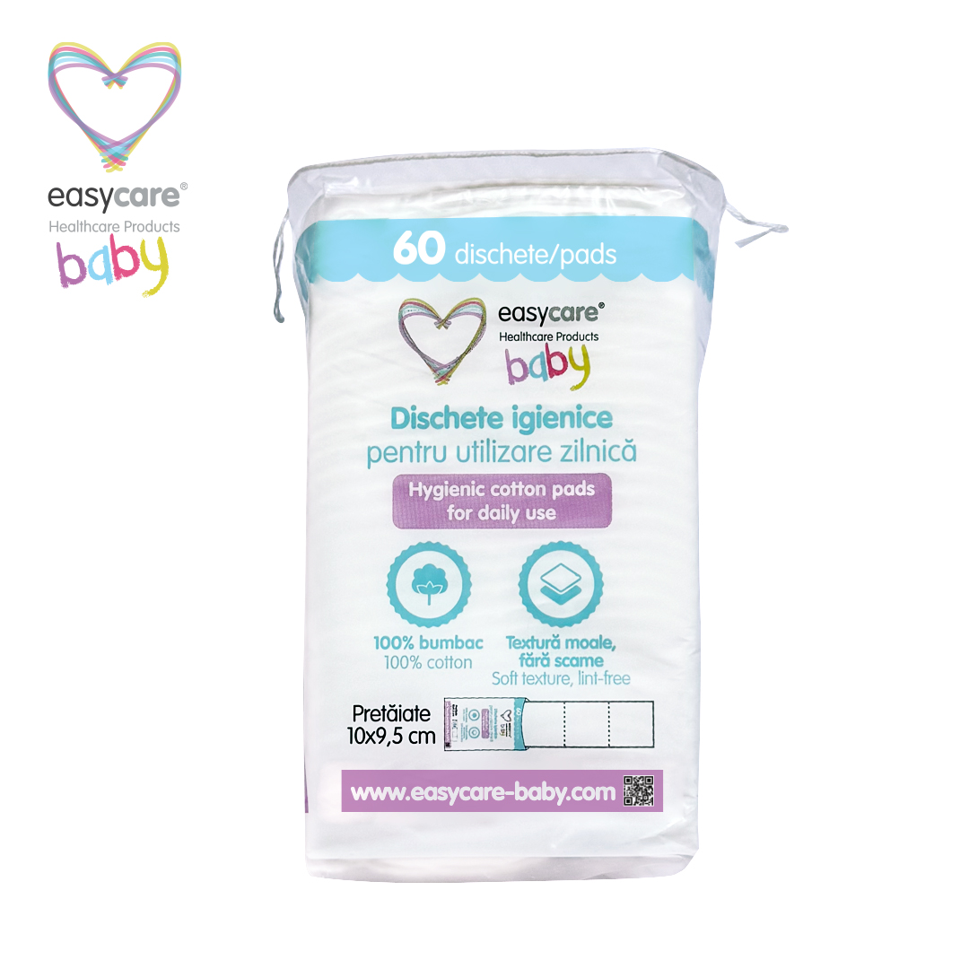 Dischetele igienice pătrate EASYCARE BABY, cu dimensiunea de 10×9,5 cm, sunt special concepute pentru îngrijirea zilnică a bebelușilor și copiilor. Realizate din material moale și absorbant, acestea oferă curățare delicată și eficientă, protejând pielea sensibilă.